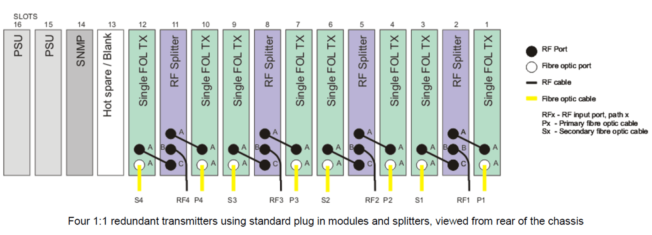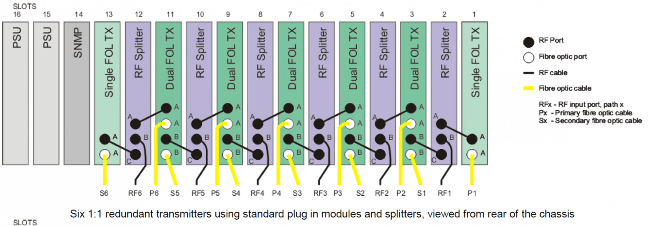 To increase the number of RF channels per 3U chassis, it is possible to use the ViaLite dual RF over fiber modules in a redundancy configuration which allows up to six fully redundant RF channels per unit.